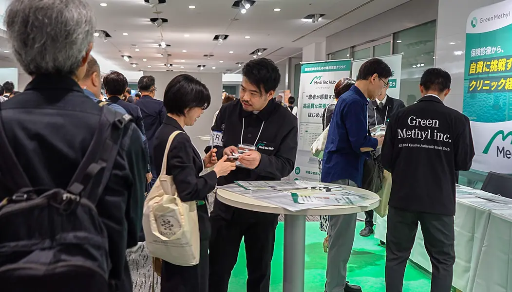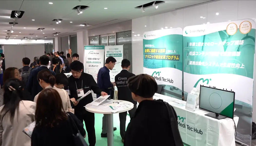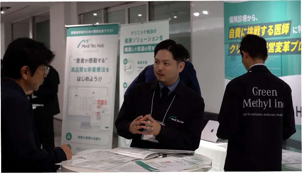 弊社ブースにも多くの先生方にご来訪いただき、保険診療から自費診療へ挑戦する医師を支援する「クリニック経営変革プログラム」ならびに「栄養療法外来ローンチプログラム」をご紹介し、経営基盤の確立から外来立ち上げまでを体系的に伴走支援する内容について高い関心と評価をいただきました。
