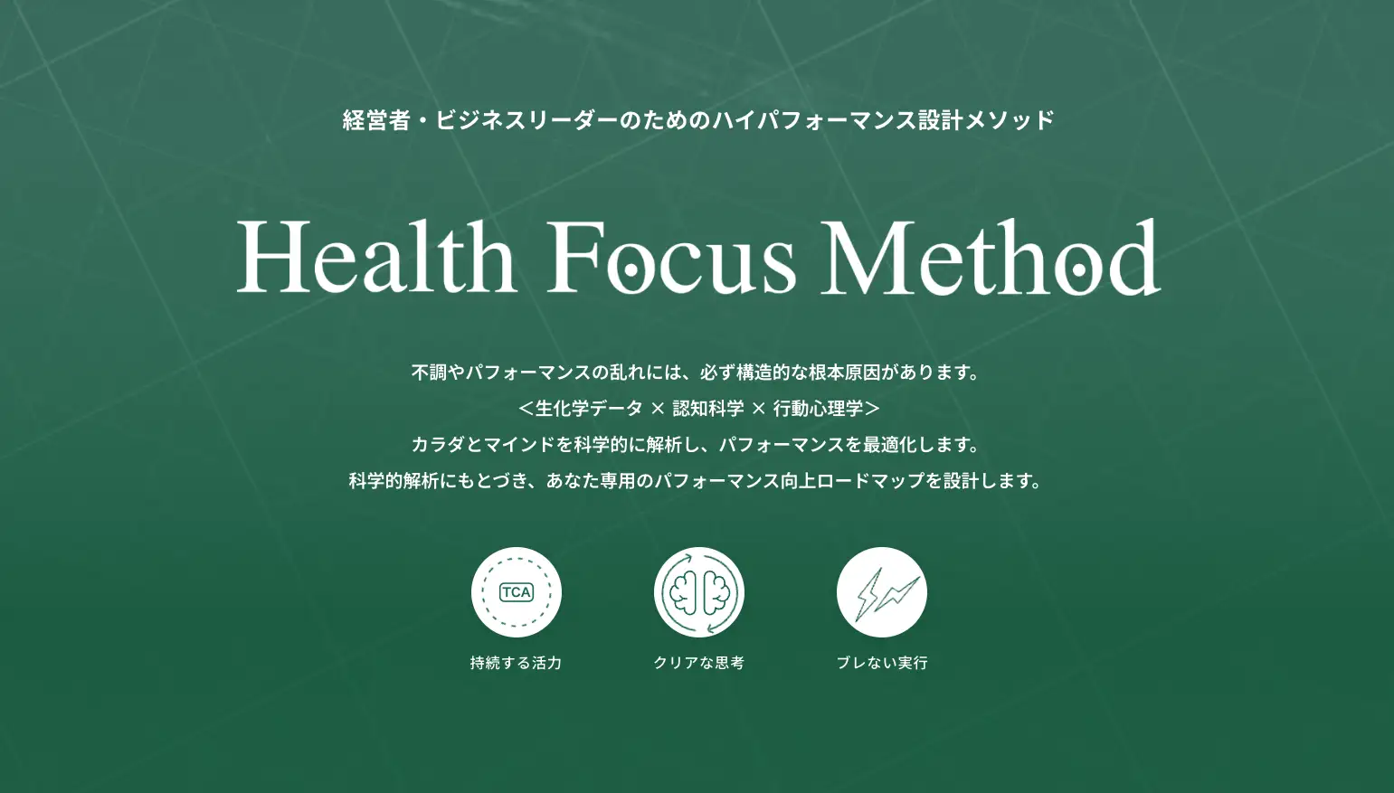 株式会社グリーンメチル(本社:埼玉県さいたま市大宮区、代表取締役:小林良太)は、経営者・ビジネスリーダー本人のためのハイパフォーマンス設計メソッド「Health Focus Method for Personal(ヘルスフォーカスメソッド for パーソナル)」の提供を開始しました。