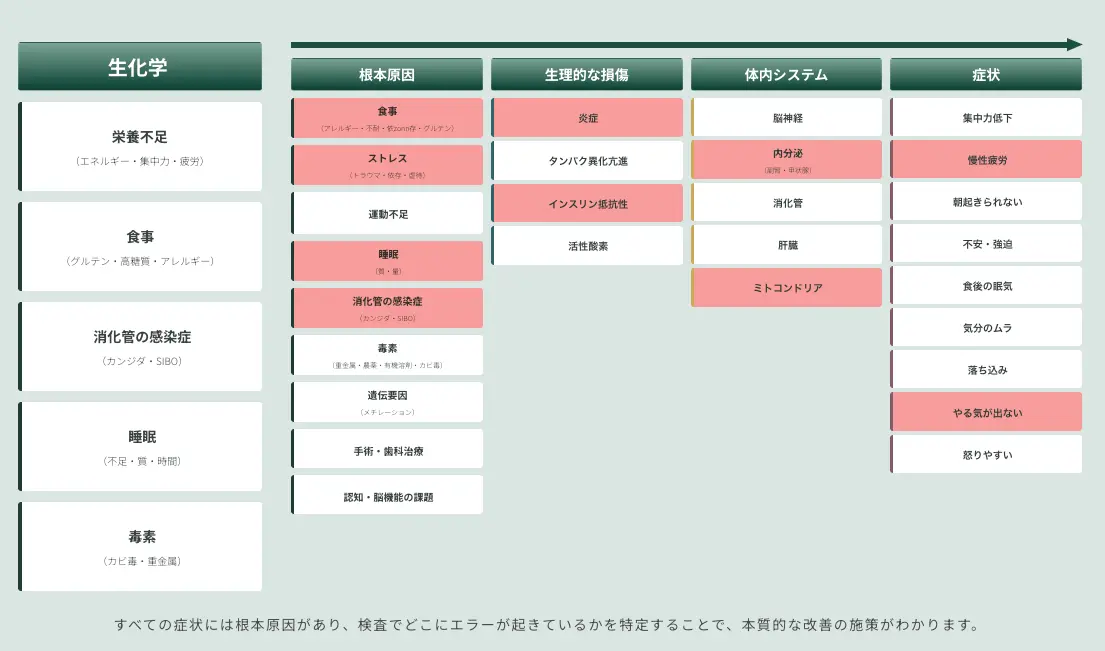 エグゼクティブヘルスコーチは、分子栄養学や機能性医学(ファンクショナルヘルス)の知見をベースに、個々の体調データや生活習慣、検査結果を統合的に分析し、「症状 → 体内システム → 生理的損傷 → 根本原因」という構造で整理された根本原因マップを用いて、現在抱えている不調やパフォーマンス低下のメカニズムを明確化します。